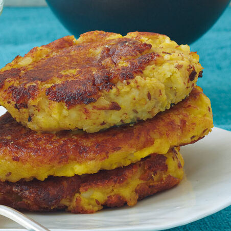 Zerdrückte Kartoffeln, Blumenkohl, Zitronensaft und Koriandergrün gründlich mischen, salzen und pfeffern. Aus der Masse 4 gleich große Plätzchen formen. Reichlich Butterschmalz oder Öl in einer beschichteten Pfanne erhitzen und die Plätzchen darin auf beiden Seiten in jeweils ca. 6 Min. braun braten.