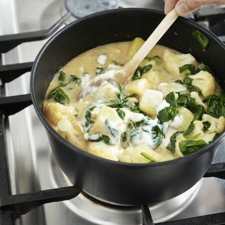 Die Kartoffeln aus dem Wasser nehmen und mit den Blumenkohlröschen zur Zwiebelmischung geben. Kartoffeln und Blumenkohl unter Rühren ca. 2 Min. bei mittlerer Hitze mitdünsten. Alles mit Paprika- und Currypulver bestäuben.