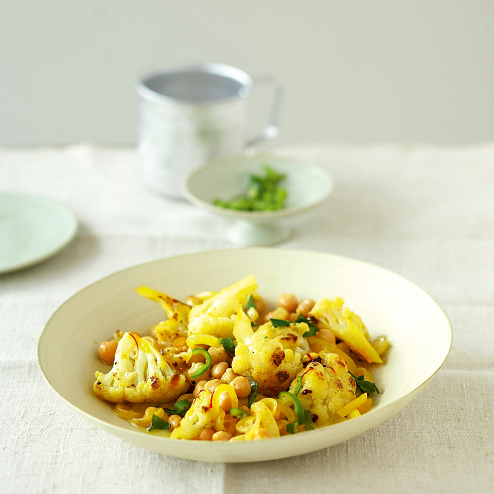 Gemüse herausheben, warm halten und die Garflüssigkeit stark einkochen lassen. Kokosmilch unterrühren, mit Salz, Pfeffer und Cayennepfeffer kräftig würzen. Kichererbsen in ein Sieb abgießen, abbrausen, abtropfen lassen und in der Kokos-Safran-Brühe erwärmen. Blumenkohl untermischen, alles kurz erhitzen. Mit Chili und Petersilie bestreuen.