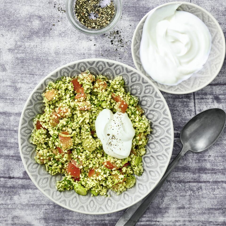 Die Tomaten waschen und ohne die Stielansätze klein würfeln. Die Frühlingszwiebeln putzen, waschen und in feine Ringe schneiden. Beides mit Blumenkohl und Dressing in der Schüssel mischen und mit Salz und Pfeffer abschmecken. Den Joghurt dazu servieren. Zum Mitnehmen den Taboulé in eine dicht schließende Box füllen, den Joghurt separat transportieren.