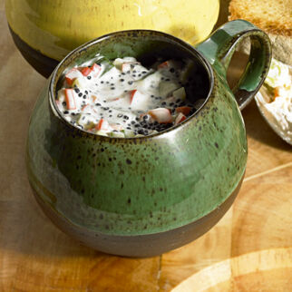 Die Pfanne säubern und die restliche Butter darin erhitzen. Zwiebeln bei mittlerer Hitze in ca. 5 Min. goldgelb braten. Mehl darüber streuen, unterrühren. Fleischsaft angießen und ca. 5 Min. sanft kochen lassen. Crème fraîche einrühren, Sauce mit Salz, Pfeffer, Senf, Zitronensaft und Essig abschmecken.
