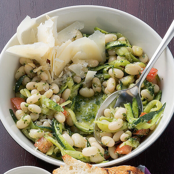 Pesto verleiht dem Bohnen-Zucchini-Salat einen sommerlichen Toskana-Touch und die Chilischote fügt eine scharfe Note hinzu.