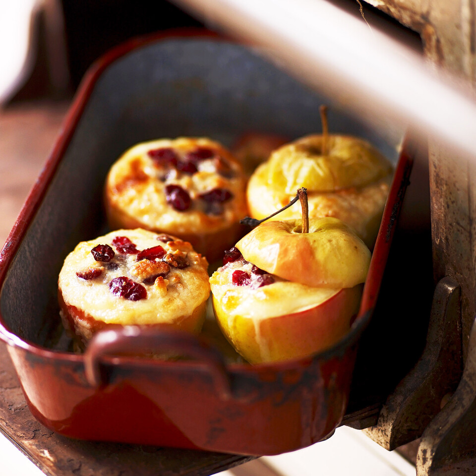 Die Schokolade grob hacken. Die Sahne mit dem Honig und dem Lebkuchengewürz in einem Topf erhitzen und die Schokolade darin schmelzen lassen. Den Topf vom Herd nehmen. Die gemahlenen Mandeln, Cranberrys und Mandelstifte zur Schokosahne geben und unterrühren. Die Äpfel damit füllen. Im Backofen (Mitte) 25-30 Min. backen. Die Deckel locker auf die Bratäpfel legen. Sofort servieren.
