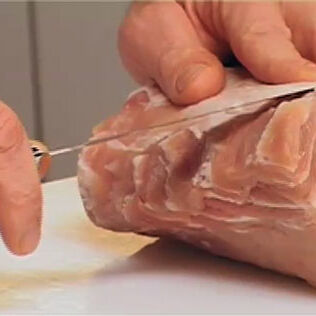 Inzwischen den Kürbis-»Hals« schälen, das Fruchtfleisch in sehr dünne Scheiben hobeln und leicht salzen. Falls nötig, den Kürbis zuvor halbieren, Stielansatz und Kerne entfernen. Die Klöße in ½ cm dicke Scheiben schneiden. Das Blech aus dem Ofen nehmen, die Temperatur auf 220° erhöhen und das Fleischpäckchen vorsichtig öffnen. Nun über das Fleisch zunächst die Kürbisscheiben, dann die Kloßscheiben schichten, sodass das Fleisch eine dichte Haube bekommt. Butter in Flöckchen teilen und darüberstreuen. Alles weitere 20 Min. im Ofen (Mitte) garen, bis die Oberfläche gebräunt und der Kürbis weich ist. Den Braten zum Servieren auf ein tiefes Blech oder eine Platte setzen und mit der Sauce servieren.