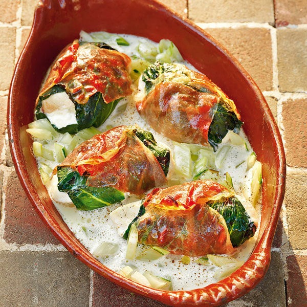In die Mitte des Hähnchenbrustfilets eine Tasche schneiden, salzen und pfeffern. Den Ricotta in die eingeschnittene Tasche füllen. Die weißen Stiele der Mangoldblätter abschneiden. Die grünen Blätter auf der Arbeitsfläche glatt auslegen und das gefüllte Hähnchenbrustfilet damit umwickeln, dann noch mit den Schinkenscheiben umwickeln.