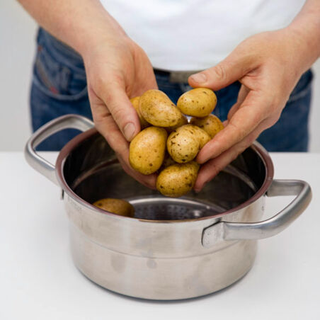 Wasser ca. 3 cm hoch in den Topf geben und aufkochen. Den Dämpfeinsatz hineinstellen und die Kartoffeln zugedeckt ca. 20 Min. dämpfen