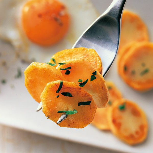 Kartoffeln schälen, in 1 cm dicke Scheiben hobeln und trocken tupfen. Das Öl in einer Pfanne stark erhitzen. Die Kartoffelscheiben kurz darin wenden, sodass sie von allen Seiten mit Öl überzogen sind. Dann gleichmäßig auf dem Pfannenboden verteilen.