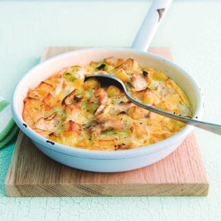 Inzwischen Zwiebel und Speck klein würfeln. Die Kartoffeln schälen und in 3-5 mm dicke Scheiben hobeln. Das Butterschmalz in einer Pfanne erhitzen. Die Kartoffeln, Zwiebel- und Speckwürfel darin ca. 8-10 Min. braten, bis die Kartoffeln leicht gebräunt sind. Mit Salz und Pfeffer würzen. Die Pfanne vom Herd nehmen.