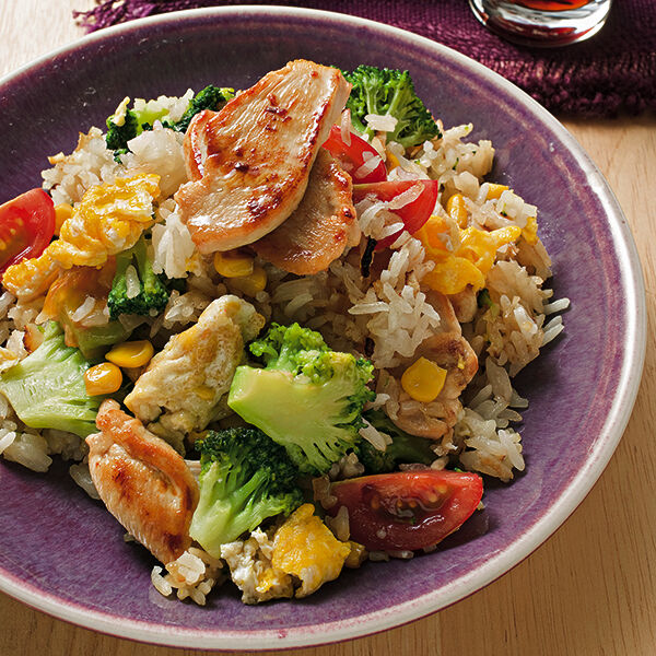 Der farbenfrohe Bratreis macht schon beim Hinschauen Appetit. Mit buntem Gemüse, zartem Hähnchenfleisch und Soja-Rührei ist für jeden Geschmack etwas dabei.