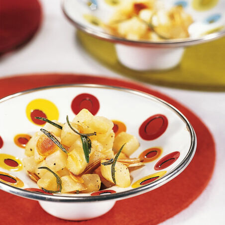 Öl in einer Pfanne heiß werden lassen. Die Mandeln einrühren und so lange braten, bis sie goldgelb sind, herausfischen. Sellerie mit Rosmarin in die Pfanne füllen und bei mittlerer Hitze 8-10 Minuten braten, bis die Selleriewürfel leicht braun sind. Dabei immer wieder durchrühren.