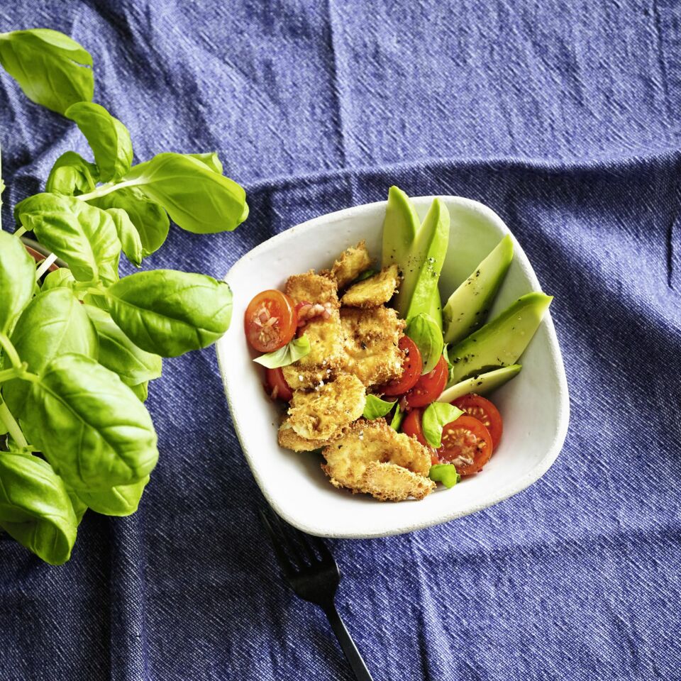 Die Avocado halbieren und den Kern entfernen. Die Hälften schälen und der Länge nach in schmale Spalten schneiden. Den fertig gebratenen Rührtofu mit Salz und Pfeffer abschmecken. Avocadospalten, marinierte Tomaten und Rührtofu nebeneinander in zwei Schalen oder auf tiefen Tellern anrichten, Avocadoscheiben salzen und mit Pfeffer übermahlen. Sofort genießen! Dazu passt Mehrkornbrot, Toast oder Baguette.
