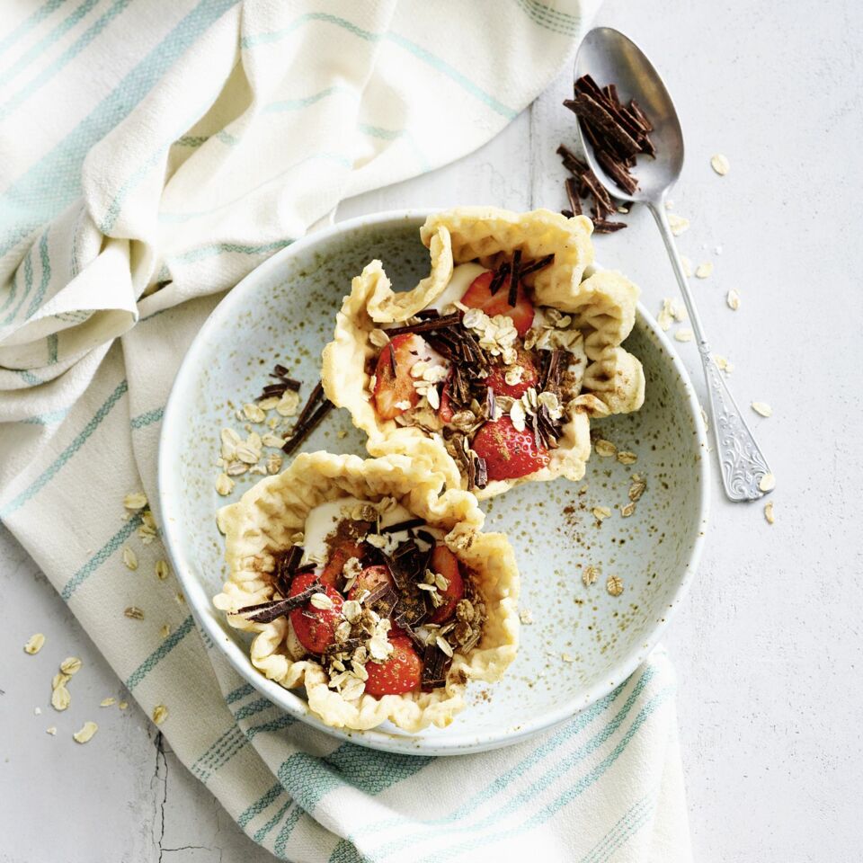 Erdbeeren waschen, vom Stielansatz befreien und halbieren oder in Scheiben schneiden. Schokolade fein hacken. Die fest gewordenen Waffelschälchen auf Teller setzen und füllen. Dazu zuerst den Joghurt hineingeben, dann restliche Mehrkornflocken, Erdbeeren und gehackte Schokolade darauf verteilen. Mit etwas Zimtpulver bestreuen und genießen.