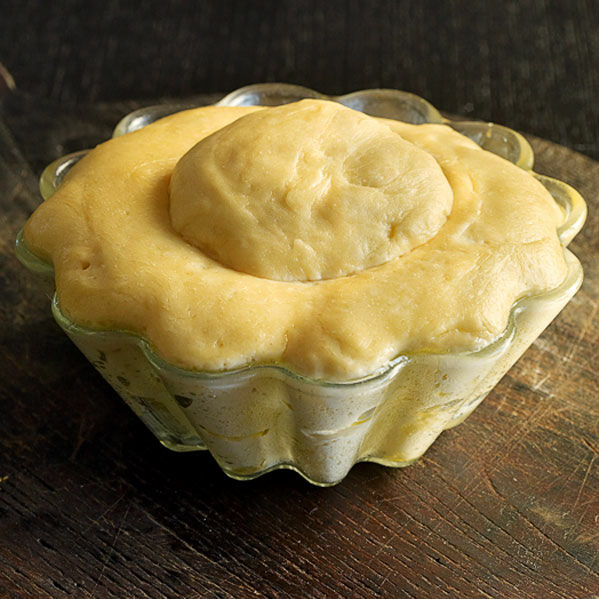 Die Form einfetten. Den Teig kurz zusammenschlagen. Bei Verwendung einer Briocheform ein ungefähr apfelgroßes Teigstück abnehmen und zu einer Kugel mit kleinem Zapfen formen. Den restlichen Teig in die Form setzen, in die Mitte eine Mulde drücken und die kleine Teigkugel mit dem Zapfen hineindrücken. Den Teig zugedeckt an einem warmen Ort noch einmal ca. 2 Std. ruhen lassen, bis sich das Volumen ungefähr verdoppelt hat.