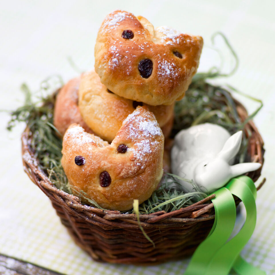 Den Teig mit einem Messer bis fast zur Hälfte einschneiden, die Hälften zu Ohren formen. Die Häschen auf die Bleche legen. Je 2 Rosinen für die Augen und 1 Rosine für den Mund eindrücken. 2 EL Milch mit 1 Eigelb verrühren. Hasen damit bestreichen. Im Ofen (Mitte, Umluft 160°) ca. 20 Min. backen.