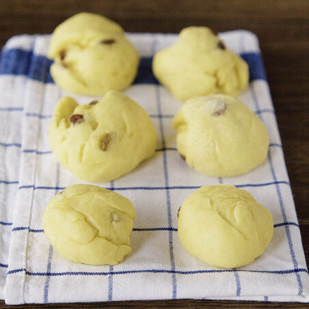 Den Teig kräftig mit den Händen durchkneten. Die Rosinen mit Mehl bestäuben und gleichmäßig unter den Teig arbeiten. Abgedeckt etwa 20 Min. gehen lassen. Backofen auf 220° (Umluft 200°) vorheizen. Die Mulden des Muffinblechs fetten. Übriges Eigelb und restliche Milch verquirlen.