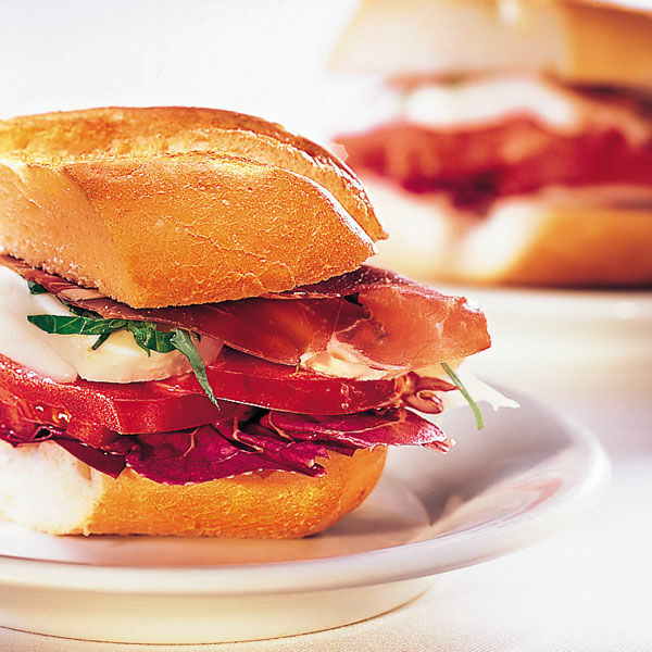 Tomaten waschen, in Scheiben schneiden. Radicchio waschen und trocknen. Brötchen aufschneiden, mit Salat und Tomaten belegen. Mozzarella und je 1 Scheibe Schinken drauf, zusammenklappen, mitnehmen oder gleich essen.