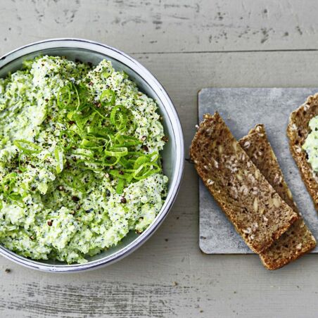 Den gehackten Brokkoli mit Frischkäse, Meerrettich, Limettenschale und 1 TL Limettensaft vermischen, mit Salz und Pfeffer abschmecken. Den Aufstrich mit den Zwiebelringen bestreuen.
