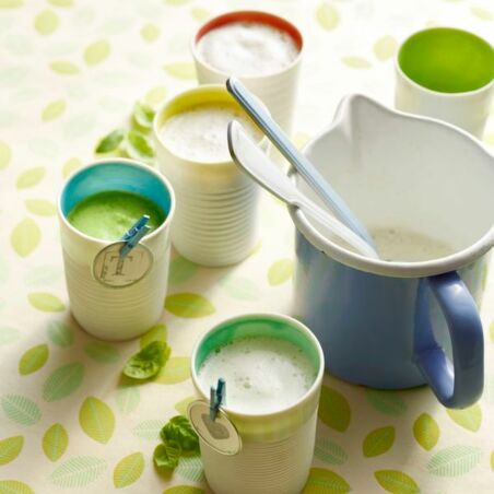 Die Milch in einem kleinen Topf erhitzen, mit dem Mandelmus verrühren und mit 1 Prise Salz würzen. Die Suppe in hitze-beständige Gläser, Becher oder Tassen verteilen. Die Mandelmilch mit einem Schneebesen oder Milchaufschäumer schaumig aufschlagen (siehe Info) und mit einem Löffel auf die Suppe geben. Mit je 1 Basilikumblatt garnieren.