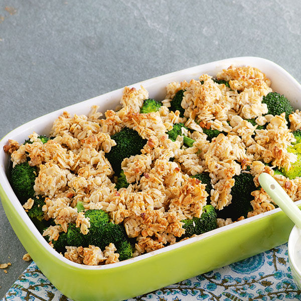 Brokkoli einmal anders, nämlich mit einer knusprigen Schicht aus Mandeln und Haferflocken. Dazu noch ein Kräuter-Joghurt - einfach fein!