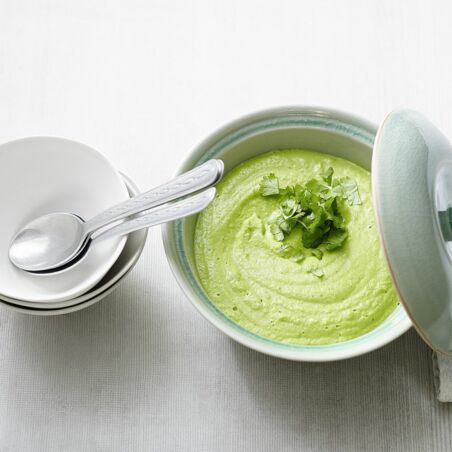 Das Koriandergrün abbrausen, trocken schütteln und mit den Stängeln grob schneiden. Gut 1 EL davon für die Garnitur zurückbehalten, den Rest zur Suppe geben und alles mit dem Stabmixer fein pürieren. Übrigen Koriander aufstreuen.