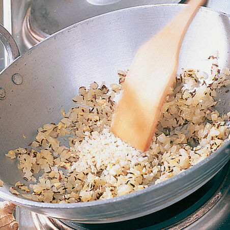 Butterschmalz im Wok erhitzen. Kreuzkümmel 1 Min. anbraten, Zwiebeln zugeben und unter Rühren 2 Min. mitschmoren. Ingwer zugeben, 1 Min. mitschmoren. Knoblauch 30 Sek. mitschmoren.
