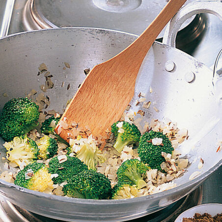 Brokkoli in den Wok geben, salzen, pfeffern und 4-5 Min. unter ständigem Rühren knapp garen. Kokosmilch angießen, etwa 3 Min. köcheln, bis die Kokosmilch etwas eingekocht und sämig ist. Mit Garam Masala bestreuen und gut mischen. Mit Kokosraspeln bestreuen und sofort servieren.