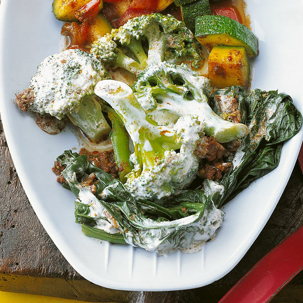 Den Brokkoli waschen und in Stücke schneiden. Den Spinat gründlich waschen und grob hacken. Beides mit 125 ml Wasser in einen Topf geben. In etwa 10 Min. bei mittlerer Hitze weich dünsten. Das Salz und die saure Sahne untermischen.