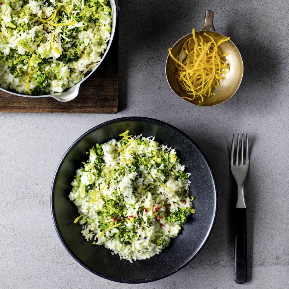 Inzwischen die Zitrone heiß waschen und abtrocknen. Etwas Schale abreiben oder mit einem Zestenschneider in schmalen Streifen abziehen. Den Parmesan reiben. Wenn Reis und Brokkoli gegart sind, Butter und Parmesan hinzufügen und alles mit Salz und Pfeffer abschmecken. Risotto mit der Zitronenschale und nach Belieben noch mit zusätzlichem Parmesan bestreuen und servieren.