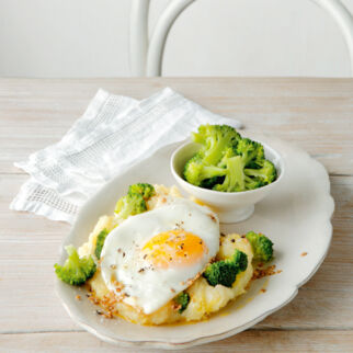 Die Kartoffel schälen und in 1 cm große Würfel schneiden. Das Öl in einer Pfanne erhitzen, die Kartoffelwürfel darin bei mittlerer Hitze 4-5 Min. offen braten, regelmäßig wenden. Crème fraîche und Brokkoli untermischen, mit Salz, Pfeffer und Muskat würzen und 3-4 Min. zugedeckt schmoren.