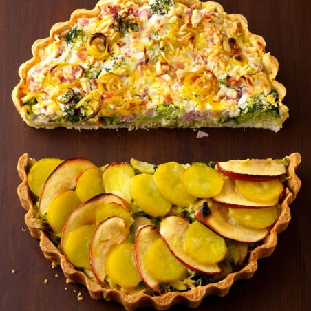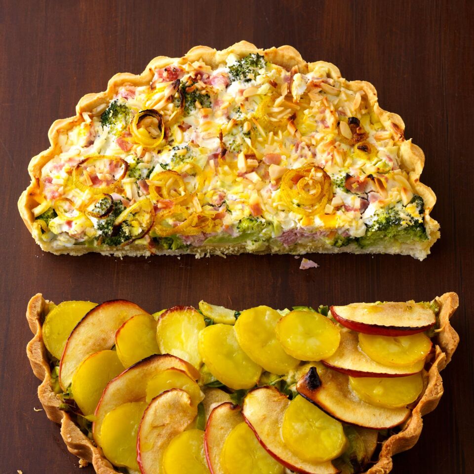 Ofen auf 200° vorheizen. Den Teig ausrollen, die Form damit auskleiden und dabei einen 4 cm hohen Rand formen. Brokkoliröschen auf dem Teig verteilen und mit der Sahnemasse überziehen. Zwiebelringe und Mandeln darüberstreuen. Im Ofen (unten, Umluft 180°) 45 Min. backen.