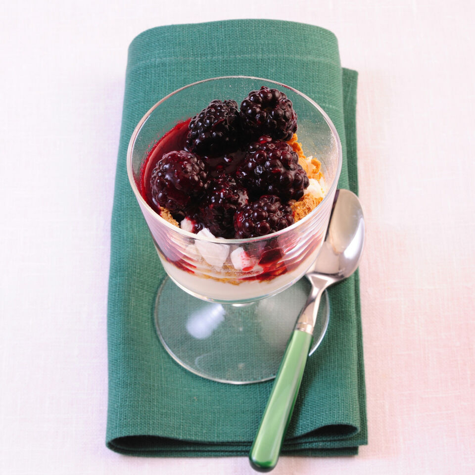 Die Amarettini und Baisers in einen Gefrierbeutel füllen und mit dem Nudelholz zerbröseln. Den Joghurt auf vier Gläser verteilen. Die Bröselmischung darüberstreuen und das Brombeerkompott darauf verteilen.
