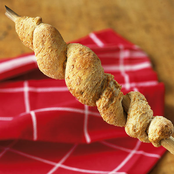 Den Teig nochmals gut durchkneten und in 8-10 Portionen teilen, jede zu einer Wurst formen und um die Spieße wickeln. Das Stockbrot über der Glut in 15-20 Min. goldbraun backen, dabei gelegentlich drehen.