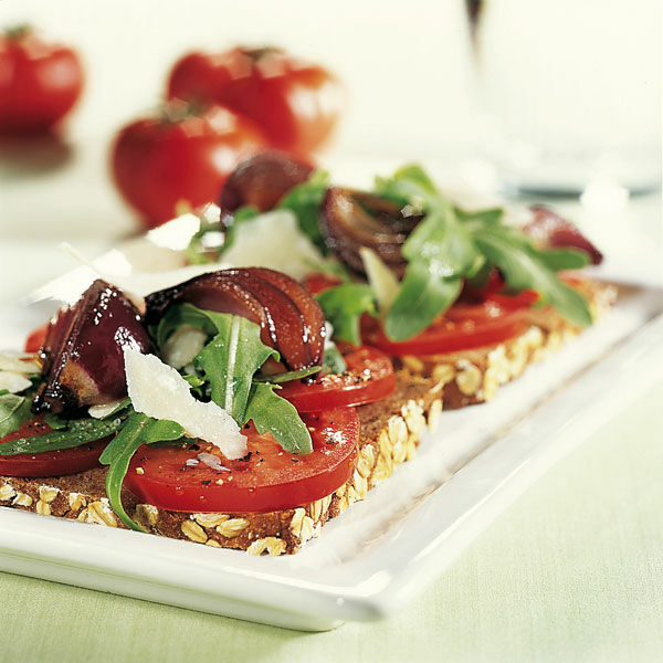Brotscheiben auf Teller verteilen, mit Rucola und Tomaten belegen, leicht salzen und pfeffern. Die karamellisierten Zwiebeln darauf verteilen. Vom Parmesan mit dem Gurkenhobel feine Späne abhobeln und auf die Zwiebeln legen. Mit dem Balsamico-Öl beträufeln und warm essen.