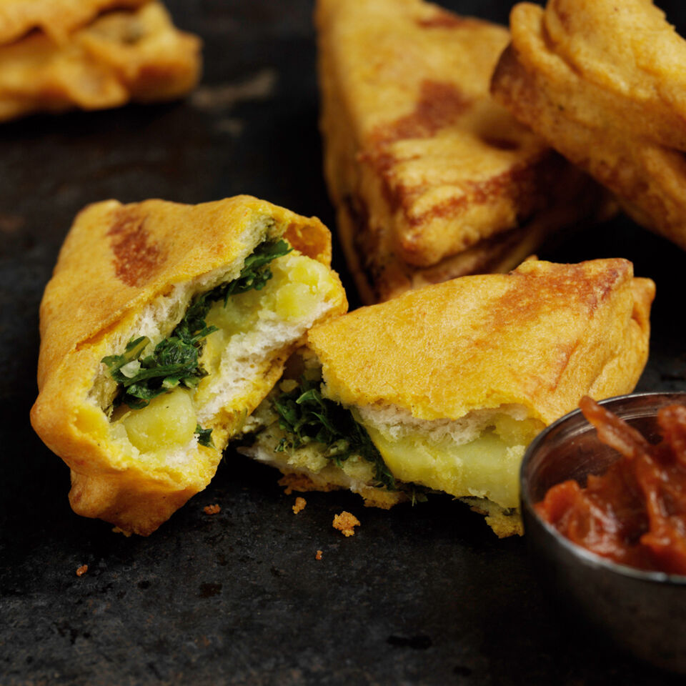 Die Kartoffeln pellen, in dünne Scheiben schneiden und auf 3 Toastscheiben verteilen. Die übrigen Brotscheiben mit Chutney bestreichen, auf die Kartoffelbrote klappen, andrücken und diagonal halbieren. Die Brote vorsichtig durch den Teig ziehen und portionsweise im heißen Öl hellbraun frittieren. Die Brotecken nochmals diagonal halbieren und z. B. mit dem Tamarinden-Dattel-Chutney servieren.