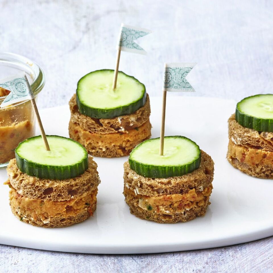 Diese niedlichen Brotkreise mit einem Kichererbsen-Tomaten-Aufstrich sind perfekt fürs Abendbrot. Die kleinen Happen sind schon mundgerecht zubereitet, damit Kinder sie besser essen können.