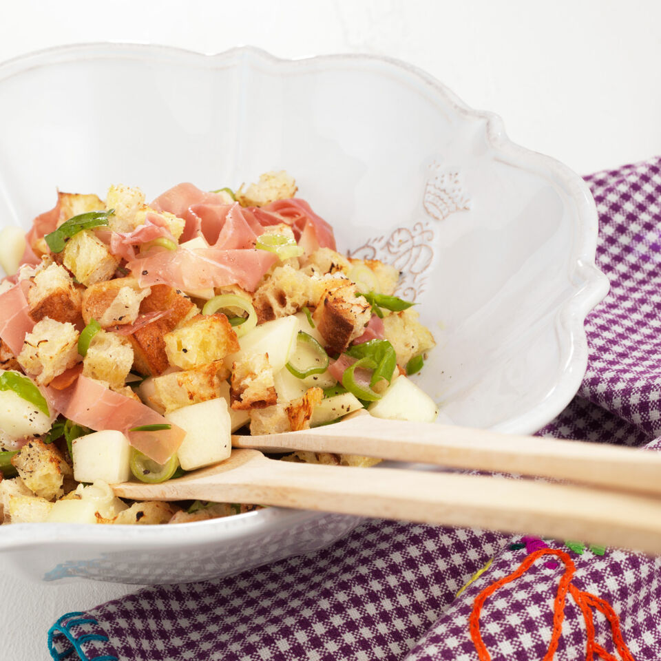 Melone mit Schinken mal ganz anders: im Salat, gemischt mit knusprigen Weißbrotwürfeln, Basilikum und Frühlingszwiebeln.