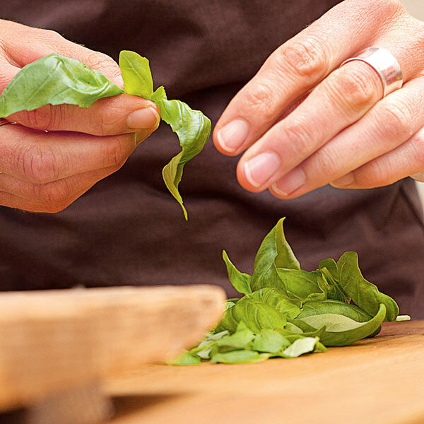 Von den Frühlingszwiebeln die Wurzelbüschel und die welken grünen Teile abschneiden. Die Zwiebeln waschen und in feine Ringe schneiden. Das Basilikum abbrausen und trocken schütteln, die Blättchen in kleine Stücke zupfen. Vom Schinken den Fettrand abziehen, den Schinken in breite Streifen schneiden.