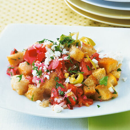 Den Essig mit Salz und Pfeffer verrühren. Das Öl unterschlagen. Brot, Zwiebeln, Knoblauch, Petersilie und Tomaten mit der Sauce mischen und alles zugedeckt für 1 Std. kühl stellen.