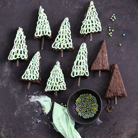 Die Eiweißglasur in einen Spritzbeutel füllen und die Brownie-Dreiecke damit von oben nach unten wellenförmig überziehen. Mit bunten Zuckerperlen verzieren und vollständig trocknen lassen. Inzwischen die Schoko-Sticks dritteln und je 1 Stick unten als Stamm in die Brownie-Tannenbäume stecken.