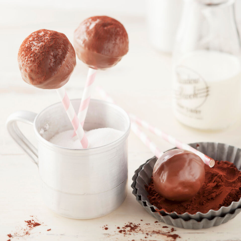 Für die Deko die Kuvertüre hacken und mit dem Kokosfett in einer Schüssel über dem heißen Wasserbad schmelzen lassen. Cake-Pop-Stiele 1 cm tief eintauchen, in die Cake-Pops stecken und diese 15 Min. kühlen. Die Pops dann in die geschmolzene Kuvertüre (bei Bedarf nochmals erwärmen) tauchen und den Überschuss abtropfen lassen. Die Brownies kurz trocknen lassen und mit Kakao pulver bestäuben.
