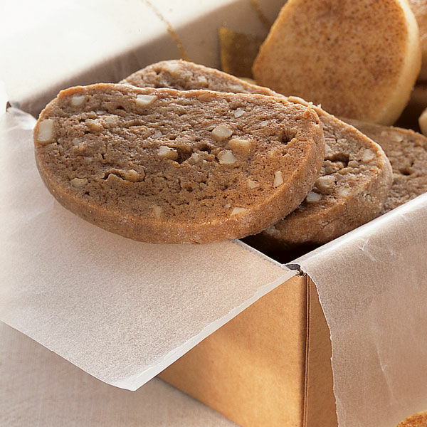Den Backofen vorheizen. Die Backbleche mit Backpapier belegen. Jede Rolle in 20 Scheiben schneiden und aufs Blech legen. Im Ofen bei 175° (Mitte, Umluft 160°) 10-12 Min. backen. Mit dem Papier vom Blech ziehen und abkühlen lassen.