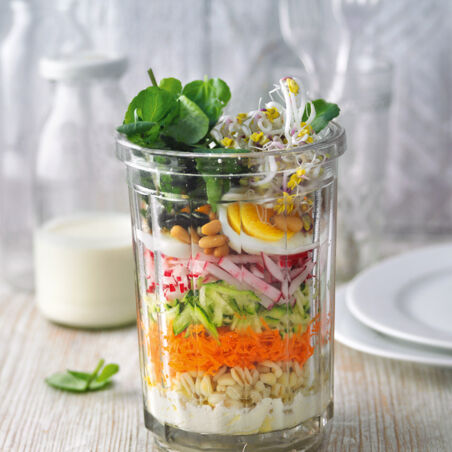 Zuerst das Joghurtdressing in das Glas gießen und den Zartweizen daraufgeben. Dann nacheinander Möhre, Zucchino und Radieschen darüberschichten. Mit den Eischeiben belegen, Brunnenkresse daraufgeben, mit Sprossen und Kernen bestreuen. Das Glas verschließen und (über Nacht) in den Kühlschrank stellen. Zum Essen den Salat auf einen Teller stürzen und gut mischen.