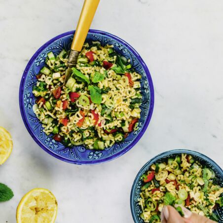 Erfrischend anders kommt dieses Taboulé daher: Bulgur und Couscous haben heute frei. Dafür zeigen Buchstabendnudeln, was sie an der Salatfront drauf haben.