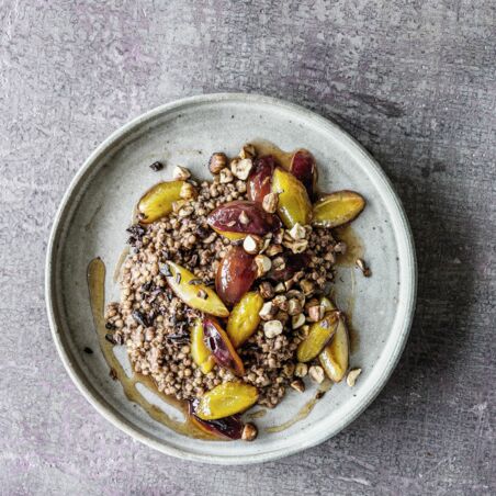 Den Brei durchrühren. Ist er zu dick, löffelweise noch etwas Haselnussdrink unterrühren, bis er cremig ist. Den Brei auf vier Schalen verteilen und die karamellisierten Pflaumen darauf anrichten. Mit den gerösteten Haselnüssen und Kakaonibs bestreuen und servieren.