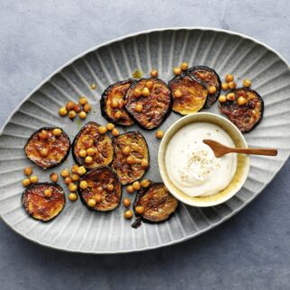 Den Ofen auf 200° vorheizen. Ein Backblech mit Backpapier auslegen. Die Auberginen waschen, putzen und 1,5 cm groß würfeln. In einer Schüssel mit 2 EL Öl und Ras el Hanout mischen. Auf eine Hälfte des Backblechs geben. Die Tomaten waschen und halbieren. Den Knoblauch schälen und fein würfeln. Tomaten in der gleichen Schüssel mit Knoblauch, Salz und Pfeffer mischen. Auf ein Viertel des Backblechs geben. Die Kichererbsen in ein Sieb abgießen, mit Wasser abspülen und abtropfen lassen. In der gleichen Schüssel mit 1 EL Öl, Salz und Kurkuma mischen. Ebenfalls auf das Backblech geben. Das Gemüse im Ofen (Mitte) ca. 25 Min. backen.
