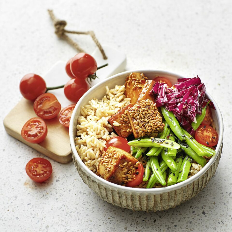 Fernöstlich leicht mit Reis, knackfrischem Gemüse und mariniertem Tofu mit Leinsamenbiss. Macht satt, glücklich und ist sogar vegan.