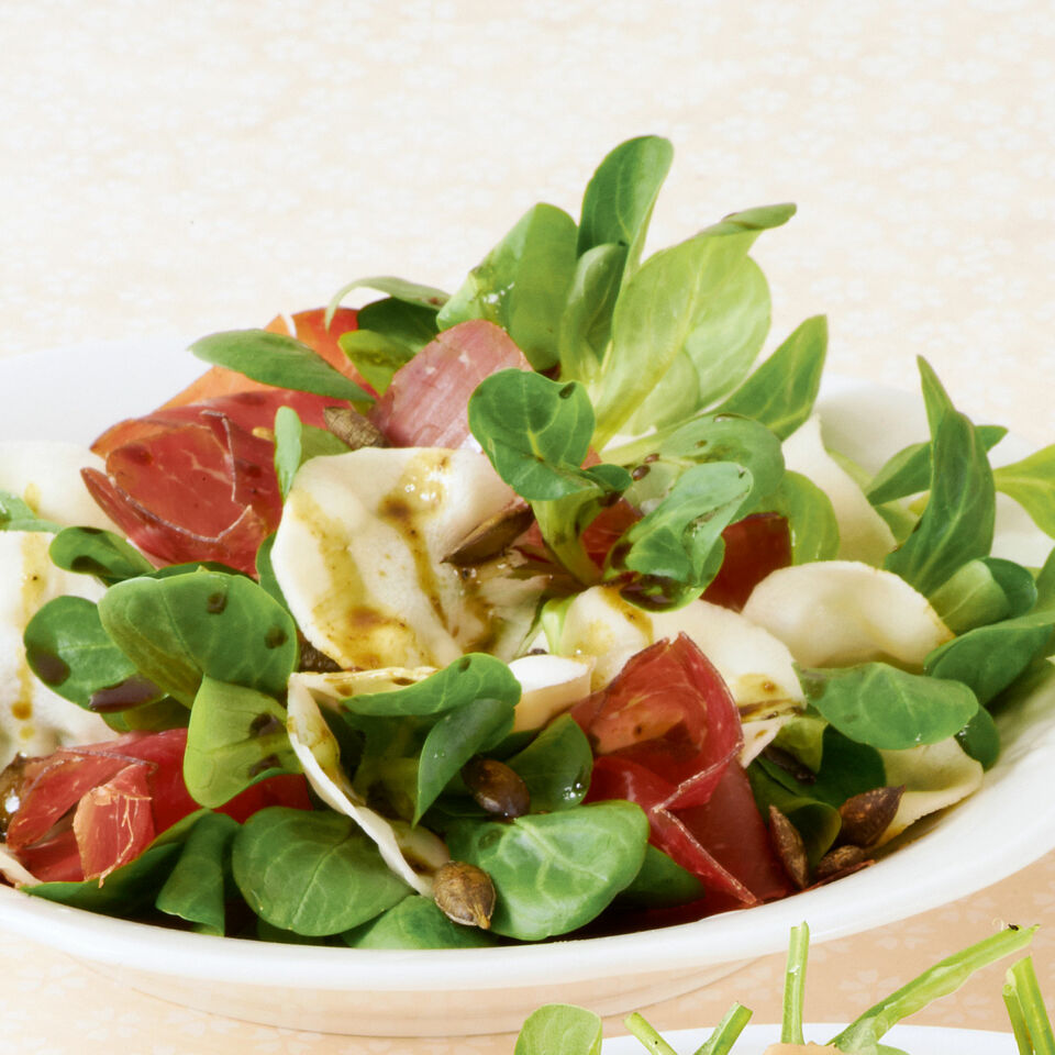 Pastinaken, ein beliebtes Wintergemüse, ist leicht bekömmlich und sanft im Geschmack. Zusammen mit Feldsalat und Bündner Fleisch läuft das Wurzelgemüse zu Hochform auf.