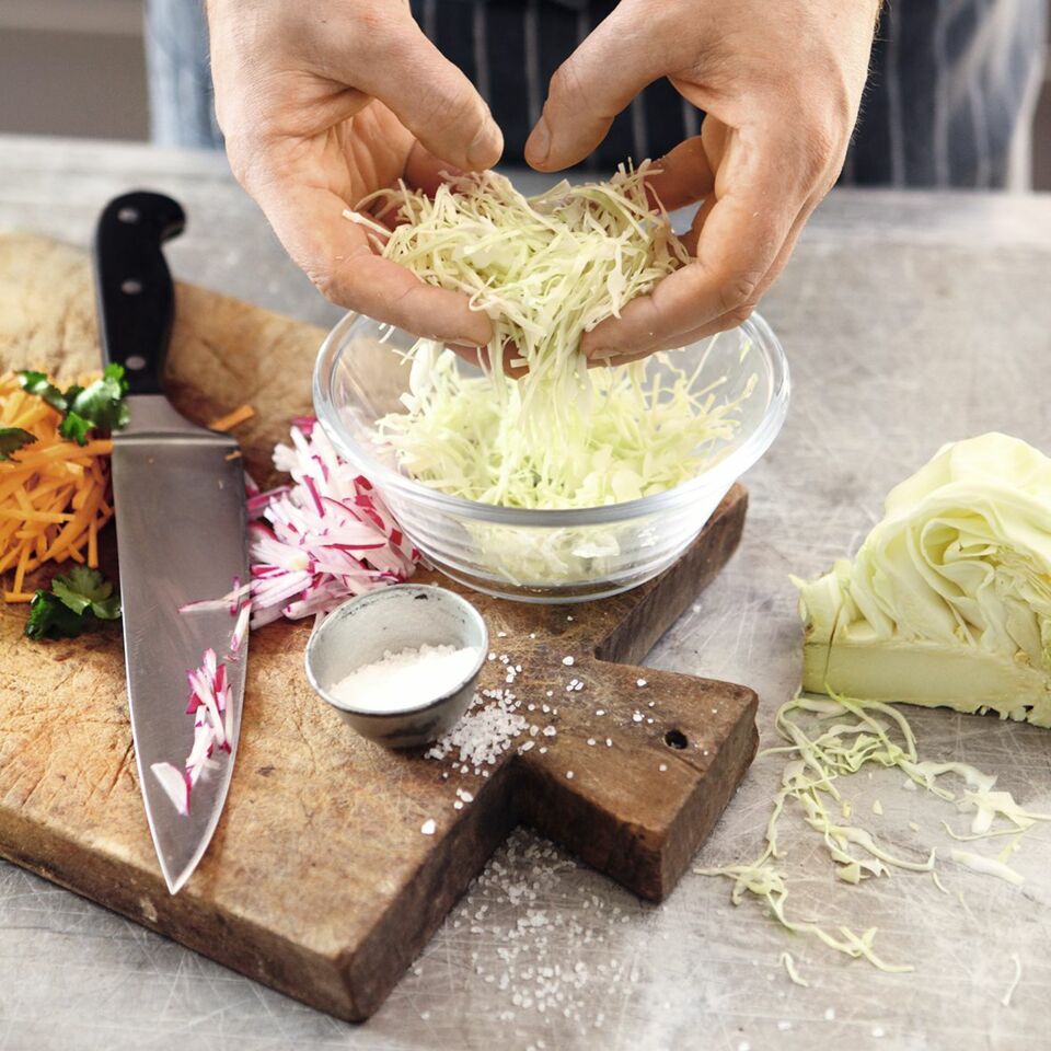 Dann übrige Frühlingszwiebeln waschen, putzen und in feine Ringe schneiden. Die Radieschen waschen und putzen, Möhre schälen und beides in dünne Streifen schneiden. Koriandergrün abbrausen und trocken schütteln, die Blättchen abzupfen. Kohlblatt waschen, trocken tupfen und ebenfalls in dünne Streifen schneiden, mit etwas Salz verkneten.