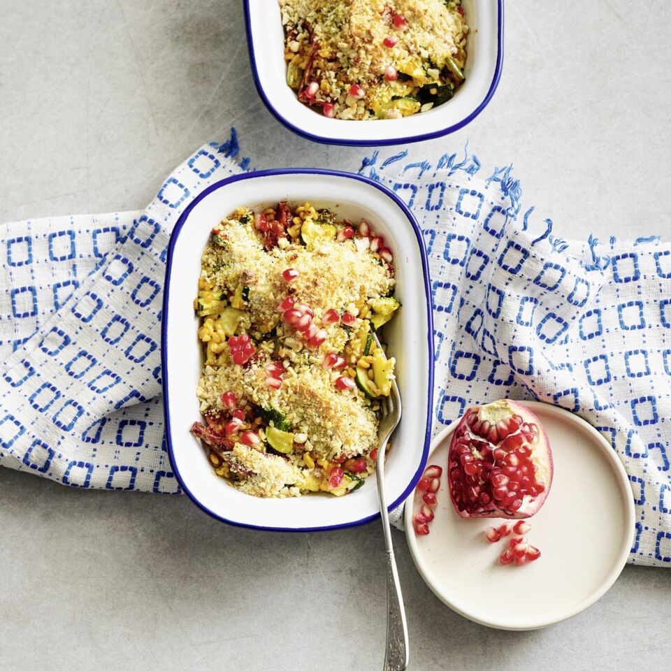 Chili-Kokos-Mix über den Bulgur streuen. Bei 220° im heißen Backofen (Mitte) 12 Min. backen, bis die Kruste leicht gebräunt ist. Die fertigen Gratins aus dem Ofen nehmen, mit Granatapfelkernen bestreuen und heiß servieren.