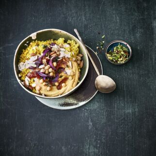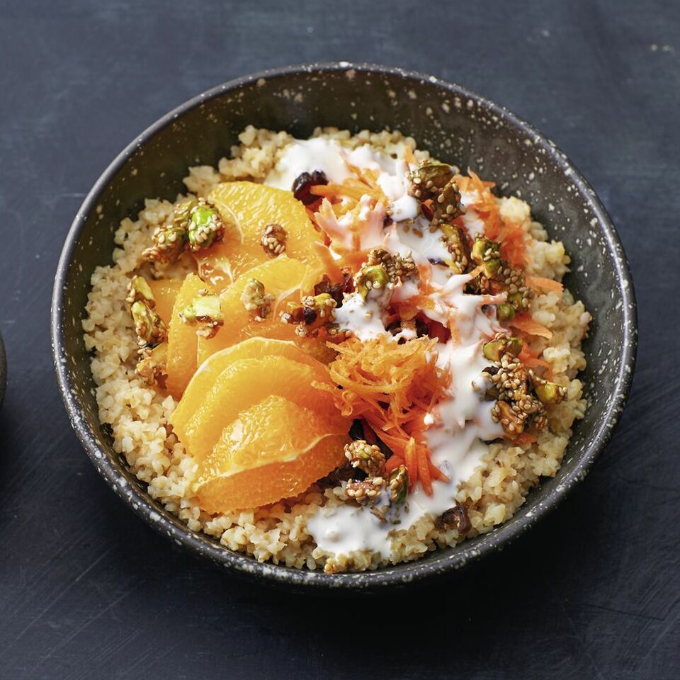 Lust auf einen orientalischen Start in den Tag? Dann probier mal diese Frühstücks-Bowl mit Bulgur, Möhren und Obst.